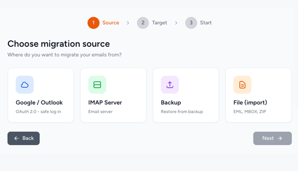 Enter your access credentials for the old and new servers. We support secure OAuth and IMAP protocols.